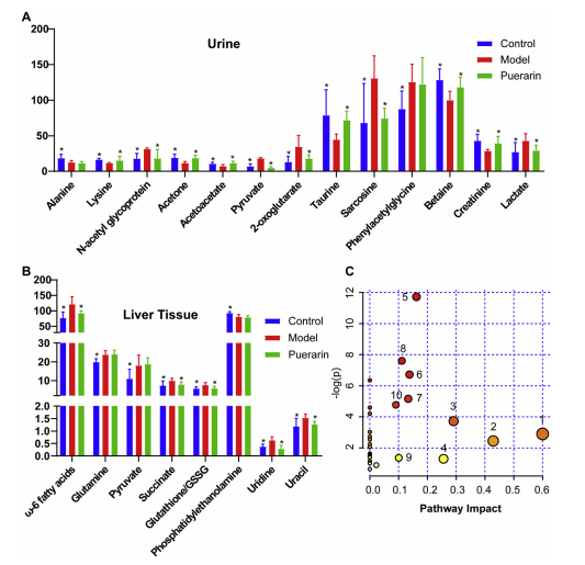 基于來自 OPLS-DA 模型的 VIP 值(VIP ≥ 1)和來自單變量統(tǒng)計分析的 P 值 (P < 0.05),8 和 13顯著改變與 NASH 相關(guān)的內(nèi)源性代謝物是分別被鑒定為肝組織和尿液中的潛在生物標(biāo)志物(圖 5A 和 B,以及表 1)。肝臟代謝特征NASH 模型小鼠的 w-6 脂肪酸水平升高,谷氨酰胺、丙酮酸、琥珀酸、谷胱甘肽/GSSG、尿苷和尿嘧啶,連同的磷脂酰乙醇胺水平降低。關(guān)于健康控制與對照組相比,模型組尿中n -乙酰糖蛋白(NAG)、丙酮酸、2-氧戊二酸、肌氨酸、苯乙酰甘氨酸、乳酸水平升高,丙氨酸、賴氨酸、丙酮、乙酰乙酸、牛磺酸、甜菜堿、肌酐水平降低。此外,除了肝臟組織中的谷氨酰胺、丙酮酸和磷脂酰乙醇胺(PE)以及尿液中的丙氨酸和苯乙酰甘氨酸外,所有與NASH相關(guān)的潛在生物標(biāo)志物均被葛根素顯著逆轉(zhuǎn)。