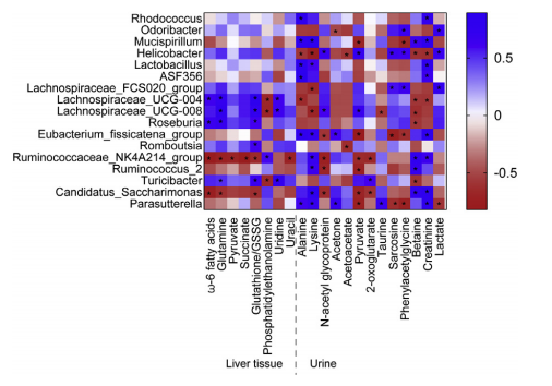 圖9. 小鼠腸道菌群在屬水平上的紊亂以及肝臟和尿液代謝產(chǎn)物的改變之間的相關(guān)性