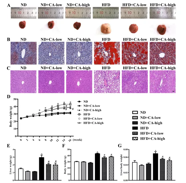 隨機分為3組(n = 10),飼養期8周。這些組包括1)高脂飲食小鼠;2) HFD+CA-low組,高脂日糧中添加0.08% CA;3) HFD+CA高組,飼喂添加0.16% CA的高脂飼糧,每2周測量體重。