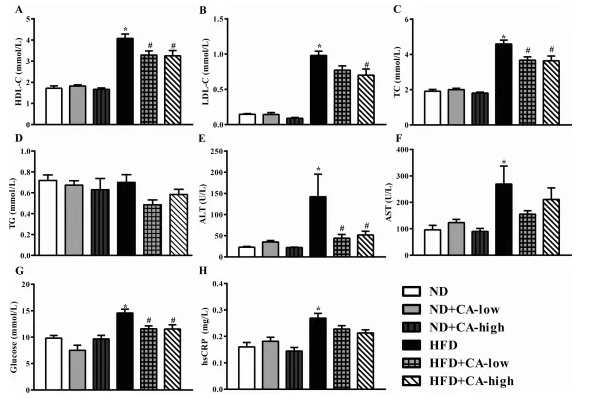 血清TC、TG、HDL-C和LDL-C升高是HFD組小鼠的主要特征。同樣,HFD組小鼠血清TC、HDL- C、LDL-C水平明顯升高,提示小鼠出現高脂血癥。CA處理在低和血清TC、TG、HDL-C和LDL-C升高是HFD組小鼠的主要特征。同樣,HFD組小鼠血清TC、HDL- C、LDL-C水平明顯升高,提示小鼠出現高脂血癥。CA處理在低和低濃度的TC、HDL-C和LDL-C對hfd誘導的血清高脂血癥有緩解作用。但各組間血清TG水平無顯著差異(圖2A-D)。在HFD組中,ALT、AST、葡萄糖和hsCRP水平均升高,而在喂食HFD的小鼠中,添加兩種濃度的CA只恢復了血清中ALT和葡萄糖(圖2E-H)。添加CA的ND小鼠與只添加ND的小鼠表現出幾乎相同的結果。