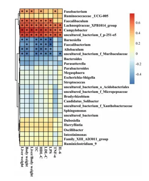 CA對hfd誘導小鼠腸道菌群組成、體增重、內臟肥胖、血脂水平、炎癥等有保護作用。我們進一步采用Spearman秩相關法對上述過濾后的糞便細菌與NAFLD相關參數進行相關性分析。我們觀察到肝臟重量、體重、肝臟/體重、血清TC、HDL-C、LDL-C、LPS、TNF-a和IL- 6水平與Allobacul^n、Barne- siella、Faecalibacterium和uncultured_bact:erium_f_Muribaculaceae的相對豐度(屬水平)呈顯著負相關。此外,相對豐度(在屬級)的彎曲桿菌,Faecalibaculum,梭菌屬,Lachnospiraceae_XPB1014_group和uncultured_bacterium__p – 251 o5呈正相關,與上面的非酒精性脂肪肝相關參數,其中彎曲桿菌,Lach nospiraceae_XPB1014_group和uncultured_bacterium__p – 251 o5顯示最重要的正相關與非酒精性脂肪肝相關參數(圖6)。與這一結果一致,Allobaculum, Barnesiella,與ND組相比,高脂喂養小鼠的糞桿菌和未培養的細菌^Muribaculaceae減少。同時,HFD組Campylobacter、Faecalibaculum、Fusobacterium、Lachno- spiraceae_XPB1014_group和uncultured_bact:erium_f_p-251-o5的相對豐度增加,CA處理顯著降低了上述腸道菌群的相對豐度。