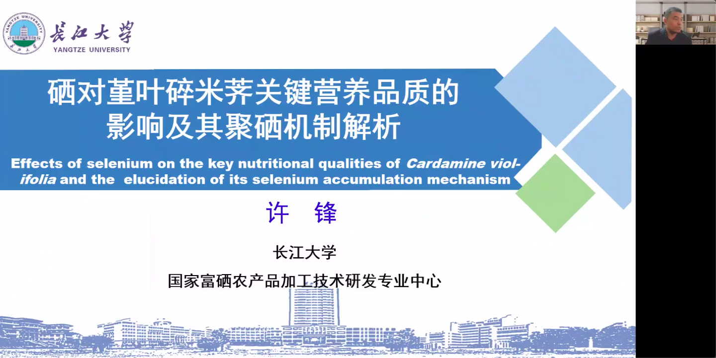 長江大學(xué)許鋒教授首先報告了外源硒處理下,堇葉碎米薺在幼苗期和成熟期都積累高含量的硒;然后講解了不同濃度的硒處理下,通過轉(zhuǎn)錄組、蛋白組和代謝組解析堇葉碎米薺的分子機制的研究工作,認(rèn)為相關(guān)基因的表達變化減少了硫元素消耗,優(yōu)化了硫元素利用,可能是堇葉碎米薺耐硒的重要原因。