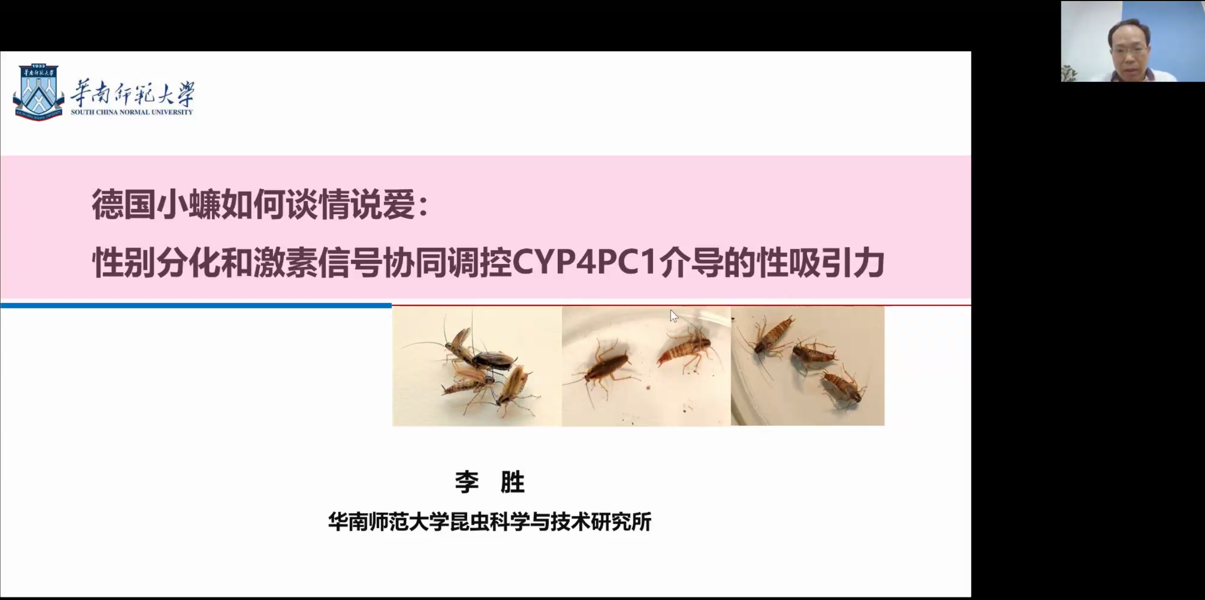 華南師范大學(xué)李勝教授風(fēng)趣的為我們介紹了德國(guó)小蠊性激素調(diào)控相關(guān)研究。研究團(tuán)隊(duì)通過轉(zhuǎn)錄組及相關(guān)驗(yàn)證實(shí)驗(yàn),在觸角中找尋到雄蟲中表達(dá)量高于雌蟲基因的CYP4PC1基因,該基因可能是控制信息素合成的關(guān)鍵基因。通過基因敲除的方式進(jìn)一步從表型中驗(yàn)證了CYP4PC1在信息素的產(chǎn)生和求偶的過程中具有重要的作用。后續(xù)研究表明,性別分化基因控制性二型CYP4PC1表達(dá)與調(diào)控,性別分化和激素信號(hào)協(xié)同調(diào)控CYP4PC1性吸引力,并使得小蠊成熟時(shí)只有一種性別具有性吸引力。最后李教授表明,通過性別分化和激素信號(hào)協(xié)同調(diào)控性吸引力可能在昆蟲和哺乳動(dòng)物中普遍存在。