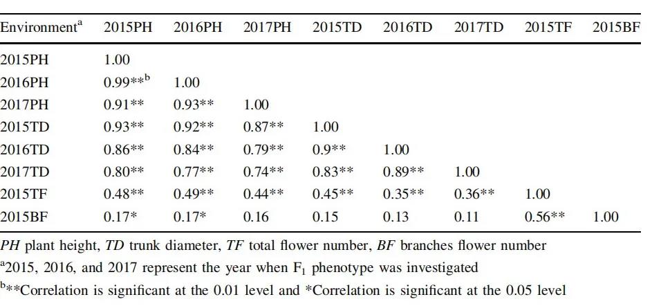 在2015-2017年,對(duì)F1群體的4個(gè)表型性狀進(jìn)行了評(píng)估,其中,PH是通過用尺子測(cè)量從地面到樹冠頂部的方式來調(diào)查;TD是記錄移接處上方10cm的直徑;TF和BF是計(jì)算總花數(shù)和分支花數(shù)。此外,相關(guān)性分析顯示,PH和TD呈顯著正相關(guān)(r>0.74, p<0.01)。