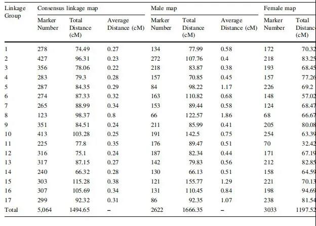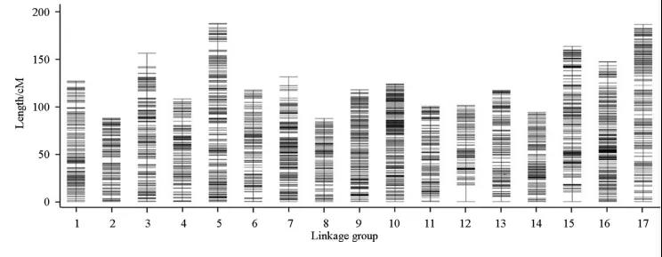 最后,利用HighMap將5113個(gè)高質(zhì)量SLAF標(biāo)記用于遺傳圖譜構(gòu)建,其中,雌性圖譜包含2622個(gè)SLAF標(biāo)記,總圖距1666.35cM。雄性圖譜包含3033個(gè)SLAF標(biāo)記,總圖距為1197.52cM。中性圖譜包含5064個(gè)SLAF標(biāo)記,形成17條連鎖群,總圖距為1494.65cM,平均圖距為0.36cM。在該圖譜中,有189個(gè)SLAF標(biāo)記在11個(gè)連鎖群中存在偏分離,包含112個(gè)SLAF標(biāo)記的LG7標(biāo)記偏分離率*高。在LG1、LG2、LG3、LG6、LG12和LG16中均未出現(xiàn)偏分離現(xiàn)象。并對(duì)以上圖譜進(jìn)行了單體來源評(píng)估、熱圖評(píng)估和共線性評(píng)估,結(jié)果表明該圖譜是高質(zhì)量的評(píng)估遺傳圖譜。