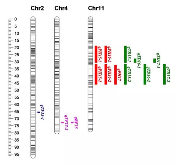 為了檢測(cè)F1群體中與4個(gè)性狀相關(guān)的位點(diǎn),對(duì)其進(jìn)行QTL分析。對(duì)于PH,結(jié)合3年的表型,在11號(hào)染色體上共鑒定到5個(gè)QTLs(qPH15-1, qPH16-1, qPH15-2, qPH16-2和qPH17),這些QTLs對(duì)表型變異的解釋范圍為17.20% ~ 22.40%。對(duì)于TD,共定位到6個(gè)QTLs(qTD15-1, qTD16-1, qTD17-1, qTD15-2, qTD16-2和qTD17-2),均位于11號(hào)染色體上,對(duì)表型變異解釋范圍為14.00~20.80%,PH與TD定位結(jié)果相重疊,均位于兩個(gè)QTL簇,該結(jié)果進(jìn)一步證實(shí)了PH和TD在表型上呈顯著正相關(guān)。對(duì)TF,定位到2個(gè)QTLs(qTF15-1和qTF15-2),分別位于2和4號(hào)染色體上,解釋表型變異率分別為8.80%和9.20%;另外,還定位到1個(gè)BF相關(guān)的QTL qBF15,可以解釋34.80%的表型變異。qTF15-2和qBF15在4號(hào)染色體被定位到同一個(gè)染色體區(qū)間內(nèi)。