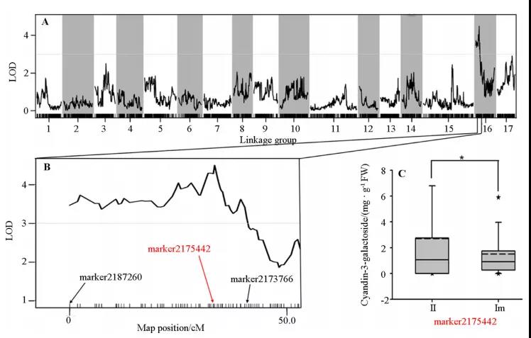 采用Kruskal-Wallis檢驗(yàn)對(duì)矢車菊素半乳糖苷濃度進(jìn)行QTL分析,采用區(qū)間作圖(IM)和多QTL模型(MQM)檢測(cè)潛在的QTL,閾值LOD為3.0。結(jié)果顯示,只在‘Red3’的LG16位點(diǎn)的頂端檢測(cè)到一個(gè)LOD值為4.49的QTL,該QTL的區(qū)間范圍為0 ~ 40.79 cM,解釋表型變異率為14.4%。此外,該QTL兩側(cè)有兩個(gè)標(biāo)記,分別是marker2187260 ~ marker2173766,作者進(jìn)一步調(diào)查了不同株型之間的表型差異,結(jié)果表明,最接近QTL峰的標(biāo)記之一mark2175442將分離群體分為純合子ll型和雜合子lm型兩類。純合子ll型表現(xiàn)出明顯高于雜合子lm 型的矢車菊素半乳糖苷濃度。結(jié)合前人的研究,該研究結(jié)果表明,LG16頂部的QTL熱點(diǎn)區(qū)域可能在控制蘋果紅肉著色中發(fā)揮潛在的作用。