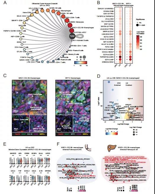 本研究進行了基于配體-受體的癌癥-免疫串擾分析,并在原發部位和轉移部位之間進行比較(圖 2A),發現SPP1+巨噬細胞和MRC1+ CCL18+巨噬細胞在LM和CRC之間的差異較大,這一結果表明肝轉移癌細胞可能優先重編程巨噬細胞并誘導其特定的功能狀態(圖 2A)。值得注意的是,LM中的轉移性腫瘤細胞優先表達配體CD47,這是一個重要的檢查點,因此可能招募相應的受體SIRPA或激活MRC1+ CCL18+巨噬細胞(圖 2B)。進一步利用mIHC來可視化這些蛋白質,觀察CD47+腫瘤細胞和SIRPA+巨噬細胞之間的串擾(圖 2C)。這些配體-受體對為靶向治療肝轉移提供了線索。
