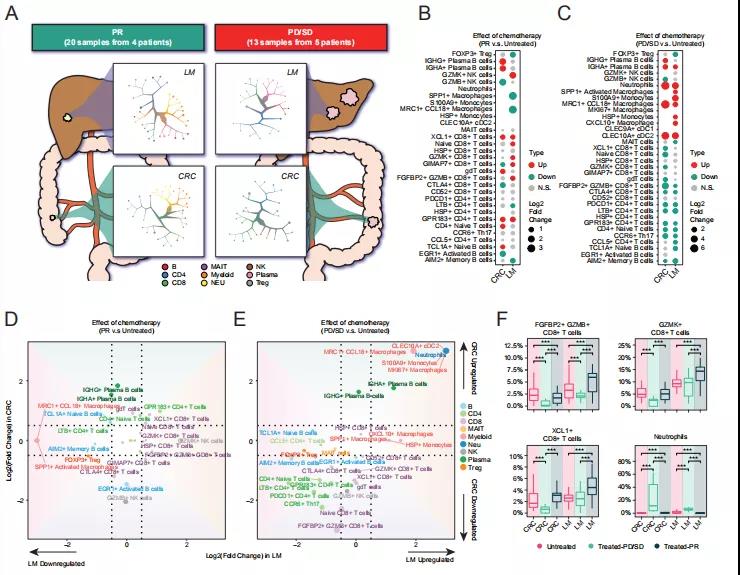 為探索NAC對腫瘤免疫的影響,本研究使用TooManyCells對所有CD45+細胞進行聚類分析,發現CRC和LM之間細胞聚類的顯著差異(圖 4A)。NAC對TME的影響高度依賴于細胞類型(圖 4B和4C)。通常,在PR中,NAC可以下調免疫抑制細胞并激活細胞毒性細胞(圖 4B)。在LM中,響應性NAC下調SPP1+巨噬細胞但上調細胞毒性T細胞,例如GZMK+CD8+ T細胞和XCL1+CD8+ T細胞(圖 4B和4D)。NAC-PR中僅剩下幾個MRC1+ CCL18+巨噬細胞和幾十個SPP1+巨噬細胞,表明NAC在抑制巨噬細胞中的潛在作用。然而,在PD/SD中,觀察到與PR不同的免疫細胞變化。例如,SPP1+巨噬細胞和MRC1+ CCL18+巨噬細胞在LM中增加,而細胞毒性免疫細胞(即FGFBP2+ GZMB+ CD8+ T細胞)下調(圖 4C、4E和4F)。這些結果可能與癌細胞的器官特異性和治療效果有關。例如,轉移性PD/SD癌細胞表現出DNA修復和脂肪酸代謝的特異性富集,而轉移性PR癌細胞與脂肪生成更相關。除腫瘤組織外,NAC上調鄰近正常肝臟中GZMB+CD8+ T細胞的比例,并增加PR患者PBMC中FGFBP2+GZMB+CD8+ T細胞的比例。對于PD/SD患者,在鄰近結腸和肝臟中也觀察到FGFBP2+ GZMB+CD8+ T細胞水平降低??傊?,有效的NAC不僅重新編程了腫瘤內免疫平衡,還激活了全身抗腫瘤免疫反應,為支持NAC在可切除CRLM中的潛在作用提供了證據。