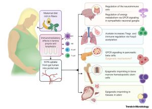 圖1.短鏈脂肪酸(SCFA)對腸道以外的器官和組織的影響,包括發育中的胎兒。富含不可消化纖維的飲食可促進微生物發酵和結腸中SCFA的產生,從而通過直接作用于腸道上皮細胞和免疫細胞來促進粘膜動態平衡。[2]