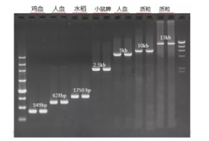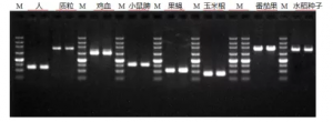 圖2:分別以人、雞、小鼠、昆蟲、質粒、玉米、水稻、番茄的全基因組DNA為模板,擴增長度分別為628 bp、2.5 kb、1750 bp、750 bp、549 bp、300 bp、1.5 kb、1.2 kb的目標片段。M:250 bp DNA Marker。