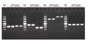 圖3:對不同GC含量(35%~65%)片段進行擴增,可實現高質量的擴增。M:250 bp DNA Marker。