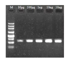 圖4:使用Biomarker HS DNA聚合酶,以不同模板量(10 pg、100 pg、1 ng、10 ng、500 ng)人基因組DNA為模板,擴增 628 bp的目的片段,發現不同模板量都可有效擴增。M:250 bp DNA Marker。