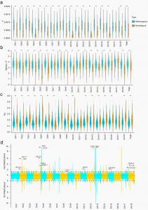 通過同源染色體比對,鑒定到3,107,171 個SNPs、 500,018 個indels、57,643 個PAVs以及632 個倒位。高雜合度區(qū)域的進(jìn)化速度比其他區(qū)域更快。