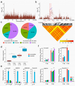 MeAHL17和MeTIR1位于2號染色體上相同的選擇性清除區(qū)內(nèi)。連鎖不平衡分析發(fā)現(xiàn),兩個基因緊密連鎖,攜帶AG(MeAHL17)和GG(MeTIR1)等位基因組合的品種顯示出較高的淀粉含量和對木薯細(xì)菌性枯萎病的高抗性頻率。