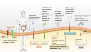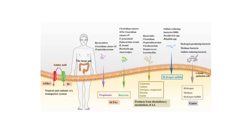 氨基酸(Amino Acids,AAs)是人體必需的物質,它不僅是蛋白質合成的原材料,還可以參與微生物代謝。人體獲取氨基酸不僅可以通過腸道吸收,還可以由微生物代謝產生。不僅如此,氨基酸組成和豐度的變化可影響代謝細菌群落,并通過TLR受體、NLR受體等調節巨噬細胞和樹突狀細胞,還可通過AhR受體、5-HT調節腸道微生物免疫軸,以及其他信號通路,所有這些通路在直接或間接調節腸粘膜免疫和微生物群方面起著關鍵作用,有助于腸道內環境平衡。[1]