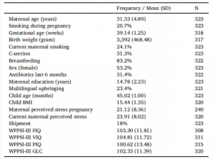 380個樣本中有364個成功進行了微生物菌群分析(圖1)。在隨后的統計分析中,排除了一名孕齡較晚的受試者、35名WPPSI-III量表測試方法不準確的受試者以及5名運輸/儲存不規范的受試者,共323名受試者。對于其余的家庭,記錄人口統計資料(母親年齡、兒童年齡、性別),產前、產期和產后因素(胎齡、出生體重、吸煙情況、剖腹產、母乳喂養、母親教育、多語言教育、兒童的BMI、抗生素使用情況)以及認知水平(WPSSI-III 總智商(FIQ),言語智商(VIQ)、操作智商(PIQ)和通用語言組合(GLC))(表1)。