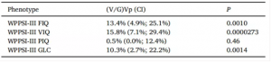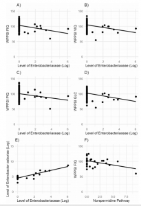 圖2和3表明腸桿菌科的一個屬(未知屬)的相對豐度與較低的WPPSI-III FIQ顯著相關。這個屬也和WPPSI-III VIQ,PIQ和GLC的低水平得分相關(圖2 A-D)。后續分析同時揭示了另外一個屬-韋榮球菌科優桿菌屬,與WPPSI-III VIQ得分相關。