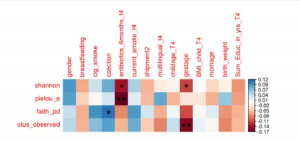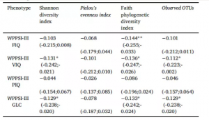 阿爾法多樣性指標與認知水平之間存在顯著負相關。如表3所示,Faith系統發育多樣性指數與WPPSI-III FIQ之間的顯著關聯。同時發現抗生素的使用與Shannon多樣性指數和Pileou均勻度呈負相關,妊娠期與Shannon多樣性指數和觀測到的物種數呈負相關,以及C-section與Faith的系統發育多樣性指數呈現正相關(圖S1)。