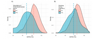 隨后對腸桿菌科內的未知屬進行了另外的分析,發現與母親年齡和吸煙與否幾個協變量是相關的。尤其是和孕婦在懷孕期間吸煙和T4時期吸煙(圖3B)相關性更為明顯。中介分析(圖3)表明腸桿菌科中該屬介導了孕婦妊娠期間吸煙和當前吸煙對WPPSI-III FIQ的影響。