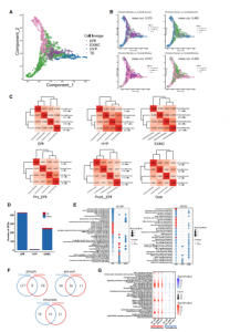 首先基于所有細胞的轉錄組學特性構建了一個導向圖(SPRING),所有細胞分為三個分支:EPI、HYP和TE(圖 2A),明確了嵌合體和對照(人和食蟹猴)胚胎之間基因表達模式的相關性(圖 2B)。當嵌合人類細胞與對照人類(0.460)或對照食蟹猴(0.459)細胞進行比較時,獲得了類似的相關系數(圖 2B,右圖),但與對照胚胎相比,嵌合猴細胞的相關系數高于嵌合人類細胞(圖 2B,左圖);接下來發現嵌合人EPI-like細胞與人胚胎中的EPI細胞相似,而嵌合人HYP和EXMC-like細胞分別與嵌合猴HYP和EXMCs細胞相關系數最高(圖 2C)。同時發現嵌合人類EPI-like細胞逐漸傾向于嵌合猴EPI細胞,R2值從0.363(植入前EPI [Pre_EPI])增加到0.464(植入后EPI [PostL_EPI]),再增加到0.693(原腸[Gast]細胞)(圖 2C)。以上結果表明猴胚胎微環境對人類細胞的基因轉錄狀態產生影響,反之亦然。