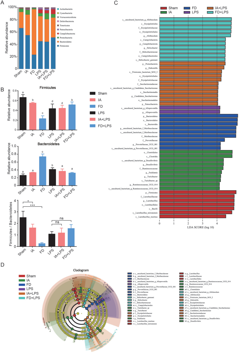 康普茶攝入對小鼠腸道微生物門水平分布產生了影響,不同組小鼠的腸道微生物群不同:在Sham組,乳酸桿菌屬為生物標志物;在IA組中,彎曲桿菌屬、法克蘭菌屬、瘤胃球菌科和脫硫弧菌屬是生物標志物;在FD組中,普雷沃氏菌科屬和未培養的細菌屬為生物標志物。異種桿菌屬是LPS組的生物標志物,FD+LPS組是幽門螺桿菌、白桿菌和真桿菌,杜博西菌和念糖菌是IA+LPS組的生物標志物。