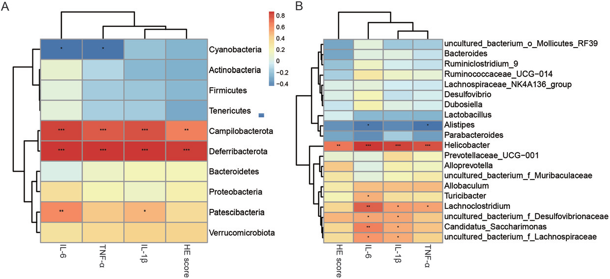 計算6組間差異,評價IL-1β、IL-6、TNF-α和HE評分對微生物群組合的影響。去鐵桿菌門與IL-6、IL-1β、TNF-α和HE評分呈正相關,相關系數分別為0.852(p<0.001)、0<0.852(p<0.001)、0.843(p<0.001)和0.852(p<0.001)。藍細菌門的豐度與IL-6(r=0.523,p<0.05)和TNF-α(r=0.520,p<0.05)呈負相關。在屬水平上,幽門螺桿菌與IL-6、IL-1β、TNF-α和HE評分呈正相關,相關系數分別為0.816(p<0.001)、0.776(p<0.001)、0.749(p<0.001)和0.635(p<0.01)。12B)。蛛網膜梭狀芽孢桿菌與IL-1β、IL-6和TNF-α也呈正相關,相關系數分別為0.700(p<0.01)、0.515(p<0.05)和0.509(p<0.05)。而腐爛別樣桿菌與IL-6和TNF-α呈負相關,相關系數分別為0.482(p<0.05)和0.517(p<0.05)。