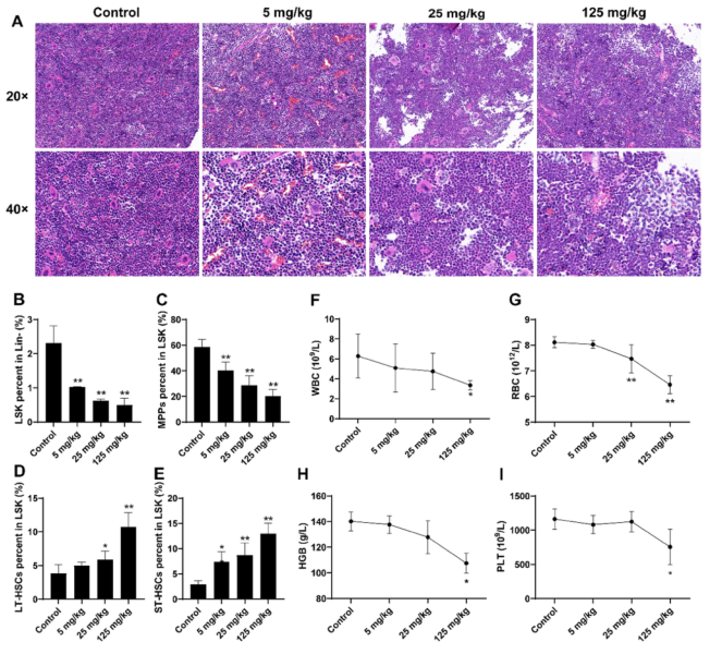 骨髓是苯暴露的主要靶器官,含有大量的造血干細胞。所有成熟的血細胞通常來源于造血干細胞( HSCs)。暴露于苯的小鼠股骨切片的H&E染色顯示出造血損傷的跡象。苯暴露小鼠骨髓中有核細胞密度明顯降低,主要表現為髓系造血細胞(WBC、RBC、巨核細胞和粒細胞)減少,細胞間隙增大,脂肪滴積聚,細胞腫脹。這些病理改變在125mg /kg苯組小鼠中更明顯,而在對照組中則不明顯(圖2A)。為進一步研究苯暴露對造血細胞生長和自我更新的影響,采用流式細胞術定量檢測造血干細胞LSK、多能祖細胞(MPPs)、長期造血干細胞(LT-HSCs)和短期造血干細胞(ST- HSCs)。這一結果表明,與對照組小鼠相比,接觸苯后LSK和MPPs降低,而 LT-HSCs和ST- HSCs增加(圖2B-E)。苯中毒是惡性腫瘤發生前的一種表現,其特征是全血細胞計數顯著減少。該研究中,125 mg /kg苯組WBC、RBC、HGB和PLT水平顯著降低(P<0.05)(圖2F-I)。綜上所述,LSK比5 mg/kg和25 mg/kg苯暴露組的血液學變化更敏感,表明LSK可能是對造血損傷反應的敏感指標。125 mg/kg苯暴露后,血液系統發生明顯變化,并形成苯毒性模型。