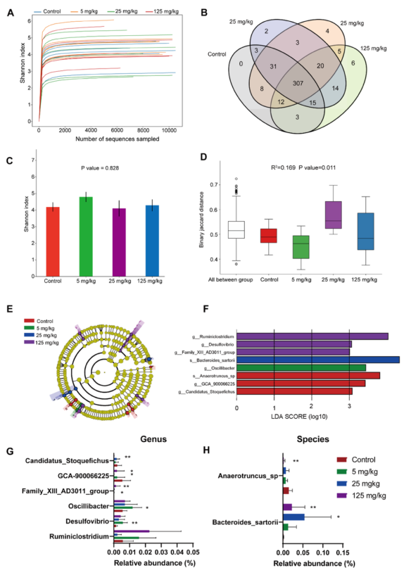采集的新鮮盲腸內容物進行16S rRNA基因測序分析,結果表明,各組的Shannon曲線趨于飽和,表明測序數據的數量和深度足以反映大部分微生物信息(圖3A)。在Venn圖中顯示了四組中共有和特有的OTUs(圖3B)。在本研究中,433個OTU中有307個是所有組共有的。接觸苯組和對照組之間的alpha多樣性并沒有導致微生物群落的差異(圖3C)。值得注意的是,beta多樣性結果顯示,暴露苯組和對照組的植物區系組成和分布有顯著差異(圖3D)。通過LEfSe分析,在暴露于苯的小鼠和對照小鼠盲腸內容物中共鑒定出8個腸道微生物群,這些差異微生物群的相對豐度主要反映在屬和種水平上的變化(圖3E-F)。在屬水平,與對照相比,125 mg/kg苯暴露組中Ruminiclostridium, Desulfovibrio 和 Family_-XIII_AD3011_group,5 mg/kg苯暴露組的Oscil-libacter相對豐度顯著提高;而GCA-900066225和Candidatus_stoquefichus的豐度則顯著降低(圖4G)。在種水平,25 mg/kg苯暴露組Bacteroides_sartorii的豐度高于對照組,Anaerotruncus_sp的豐度呈相反的趨勢(圖4H)。