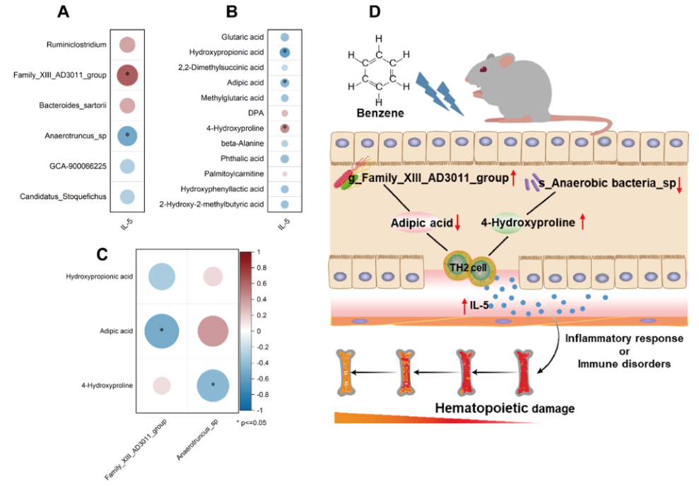 前人文獻表明TH2細胞分泌和產生了上調的細胞因子(如IL-4、IL-5和IL-10),并在機體中發揮重要的免疫作用。IL-5在苯暴露組和對照組表現出顯著的劑量-反應關系,與造血損傷呈極顯著負相關。分析表明與IL-5與Family_XIII_AD3011_group呈顯著負相關,與Anaerotruncus_sp呈正相關(圖6A)。此外,羥丙酸和己二酸與IL-5呈負相關,而4-羥脯氨酸與IL-5呈正相關(圖6B),Family_XIII_AD3011_group和Anaerotruncus_sp的豐度變化分別與己二酸和4-羥脯氨酸呈顯著負相關。綜上所述,Family_XIII_AD3011_group和Anaerotruncus_sp可能調節了已二酸和4-羥脯氨酸的產生水平,這些代謝產物進一步激活TH2細胞大量分泌IL-5,引起促炎反應或免疫紊亂(圖6D)。這可能是苯誘導造血毒性的初步潛在機制,有待進一步研究證實。