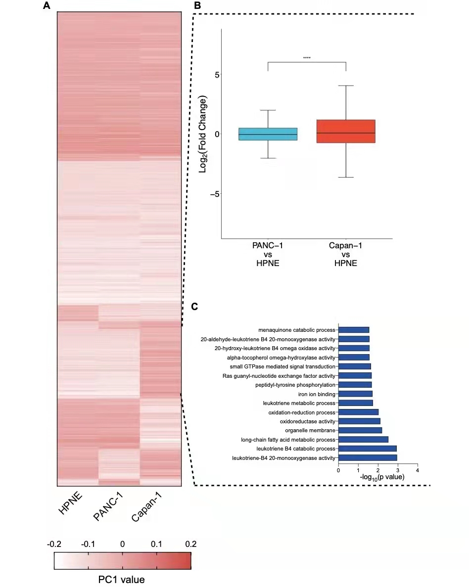 作者對Compartment利用PC1值進行聚類分析,以確定正常和原發癌細胞的B區室轉變為轉移癌細胞的A區室(圖1a),并且位于這些區室中的基因表現出更高的表達(圖1b)。GO富集分析結果顯示,這些基因富含Ras/small GTPase 、 oxidation–reduction term,而這些是胰腺癌進展所必需的。這些結果提示,Compartment重排可能促進胰腺癌的轉移。