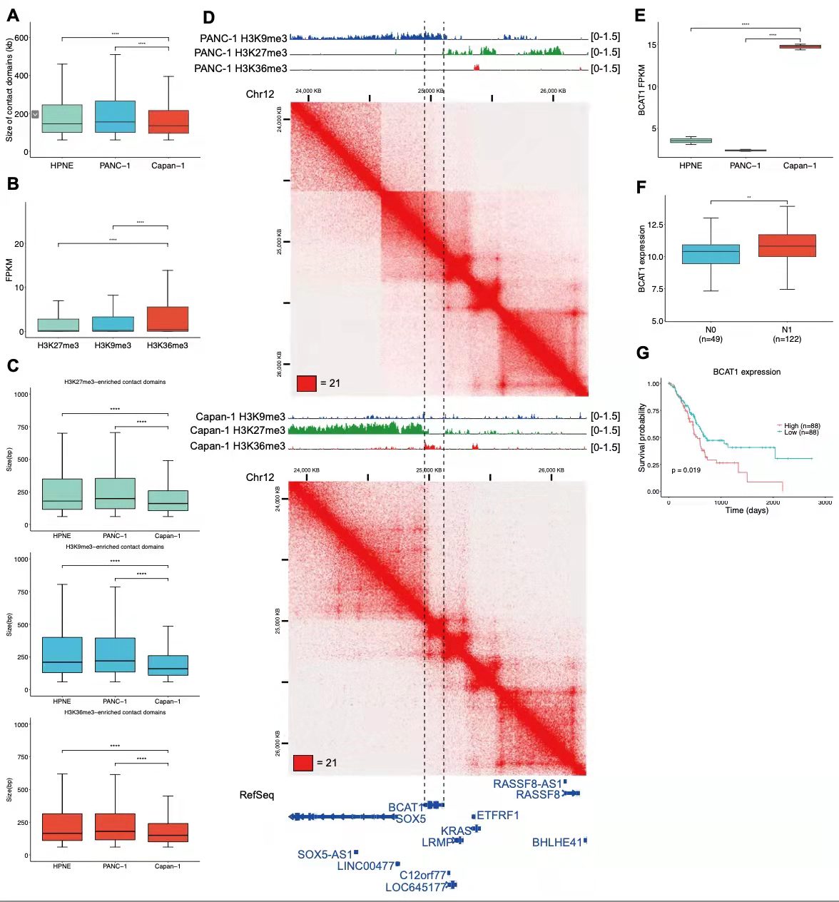 通過Chip數據分析,與轉移癌相比,原發癌具有更高的H3K27me3富集的特異性TAD,表明轉移過程中,非活性的TAD轉變為活性的TAD。例如BCAT1基因,是重新編程支鏈氨基酸代謝所必需的,位于新的富含H3K36me3的TAD中(圖2d),并且其表達量顯著升高升高(圖2e)。根據TCGA數據集顯示,BCAT1在有淋巴結轉移的胰腺癌樣本中BCAT1表達上調(圖2f)(p=0.02,Student t檢驗),并且BCAT1表達與總生存率呈負相關(圖2g)(p=0.028,對數秩檢驗)。總之,這些結果表明,在胰腺癌轉移過程中,結構域的分裂可能與表觀遺傳狀態的改變相結合。