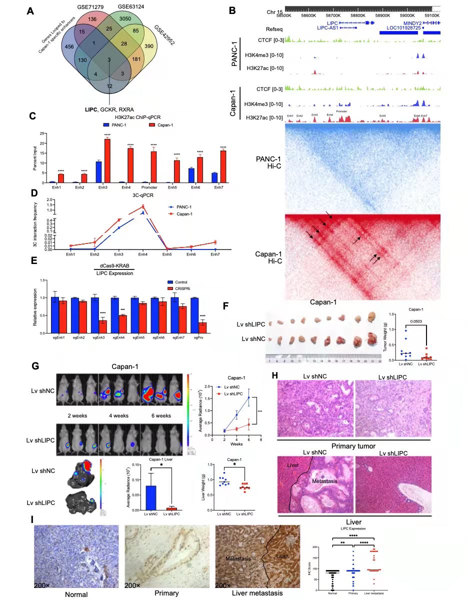 作者通過Hi-C圖譜強調了來源于肝轉移的胰腺癌細胞在不同染色質級別上表現出顯著差異。發現轉移性胰腺癌細胞的Compartment重排更為明顯。此外,在胰腺癌轉移過程中,TAD在基因組和表觀基因組上發生改變,其變得更小和更多,這與組蛋白修飾的變化有關。同時,作者發現3D表觀基因組重編程確實存在,并鑒定了600多個與胰腺癌轉移特異性相關的基因。并通過各種實驗,確定了關鍵候選基因LIPC在轉移癌中與特異性增強子成環,并在胰腺癌轉移病灶中顯著上調。LIPC可以促進胰腺癌的遷移、侵襲和EMT(上皮細胞-間充質轉化)過程,這些結果強調了LIPC在胰腺癌轉移中的重要作用,并證明3D表觀基因組重編程可以上調轉移促進基因以促進胰腺癌轉移。