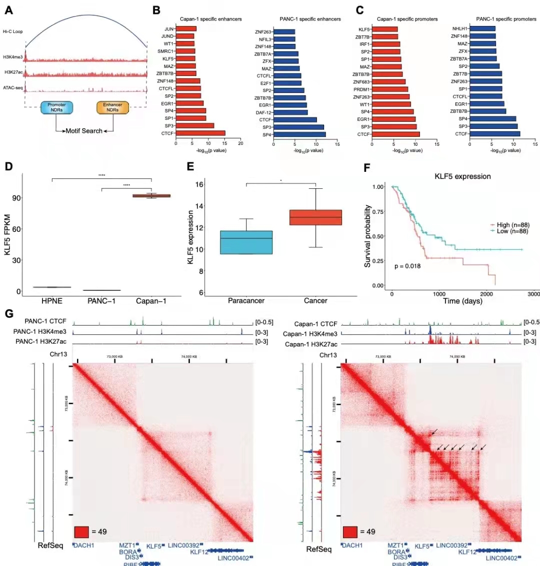 先前的研究表明KLF5對胰腺癌的進展至關重要,而在本次研究中,KLF5的motif在轉移特異性增強子和相應的啟動子處富集(圖6b-c)。RNA-seq分析顯示KLF5在轉移癌細胞中顯著上調(圖6d)。此外,通過TCGA數據分析,發現胰腺癌樣本中KLF5的表達高于正常樣本(圖6e),并且KLF5的高表達與胰腺癌患者的不良預后相關(圖6f)。利用多組學數據,作者確定了轉移癌細胞中KLF5啟動子區域的特有的幾個增強子(圖6g,黑色箭頭)。總之,轉移特異性增強子環到幾個關鍵TFs的啟動子,這些TFs可以介導額外的增強子啟動子成環來上調與胰腺癌轉移相關的基因。