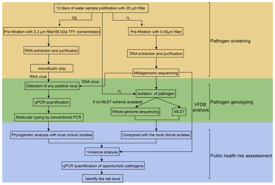 水生病原體可引起嚴重疾病,如霍亂、鉤端螺旋體病、傷寒或腹瀉。鑒于這些新出現的疾病的不可預測性和高度多樣性,水傳播病原體監測的關鍵挑戰之一是優先為局部暴發做好準備。為應對這些挑戰,該研究分三個步驟進行公共衛生風險評估:潛在病原體篩選、病原基因型確認、與當地臨床資料比較。