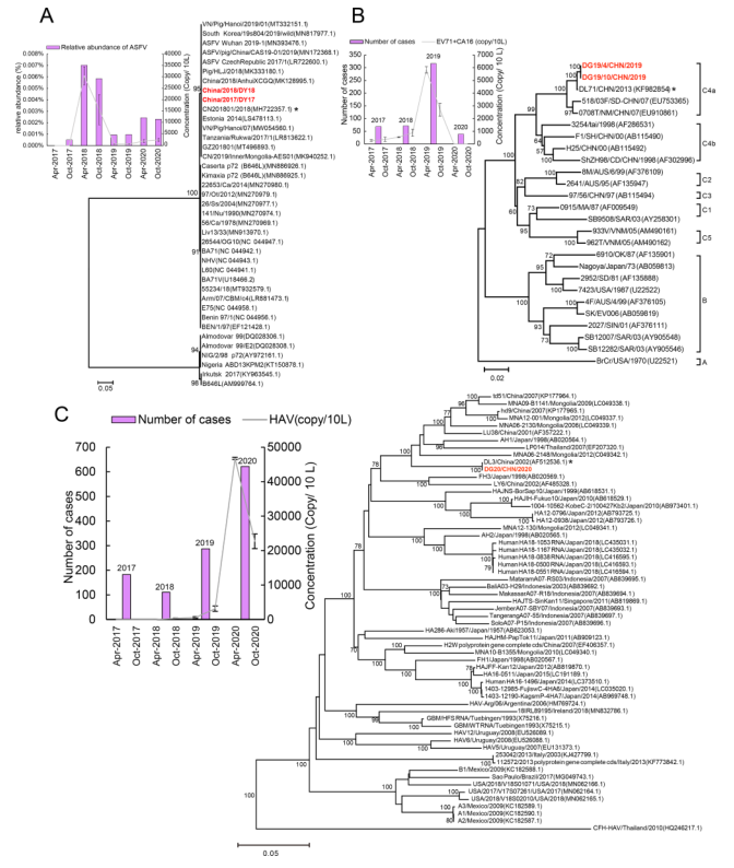 在DY發現了非洲豬瘟病毒(ASFV)和豬痘病毒(Swinpox Virus)等幾種病毒。ASFV在2017年10月被檢測到,并在2018年達到頂峰(圖6A),并通過qPCR證實。qPCR在2018年4月后連續檢測到ASFV,其中2018年4月的病毒載量為3.0×103拷貝/L。在DG地點未檢測到ASFV和Swinpox病毒,在兩個地點均未檢測到其它人畜共患病DNA病毒。通過高通量微流控芯片檢測檢測了40種致病性RNA病毒的存在。DY樣品中,經qPCR確認,2019年僅檢測到諾如病毒、流行性腮腺炎病毒、鼻病毒和Human herpesvirus 6病毒。DG樣品中,2017年至2019年在樣本中檢測到human enterovirus 71 (EV71),2020年4月檢測到Coxsackievirus 16 (CA16)。