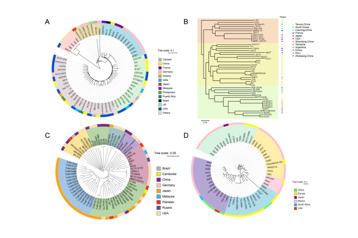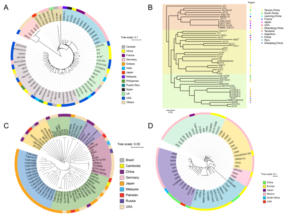 從湛江樣品中選擇了4株無MLST方案的病原菌,A. junii , V.alginolyticus, S. algae 和A. hemolyticus進行全基因組測序(WGS)。結果表明,V. alginolyticus與本地水產養殖場的菌株有親緣關系,表明它們是該地區特有的(圖5A)。S. algae ZJ61與我國山東的4株臨床分離株有親緣關系,而S. algae ZJ-SH在一個獨立的分支上(圖6B)。結合75個A. junii基因組進行系統發育分析,2018年東港水樣分離株JZ20與2020分離株JZ102(圖6C)聚為一類。對57個A. hemolyticus基因組分析,湛江分離株ZJ54與從醫院分離的SZ3452有親緣關系(圖6D),分離株HK30與醫院的菌株XH900聚在一起。
