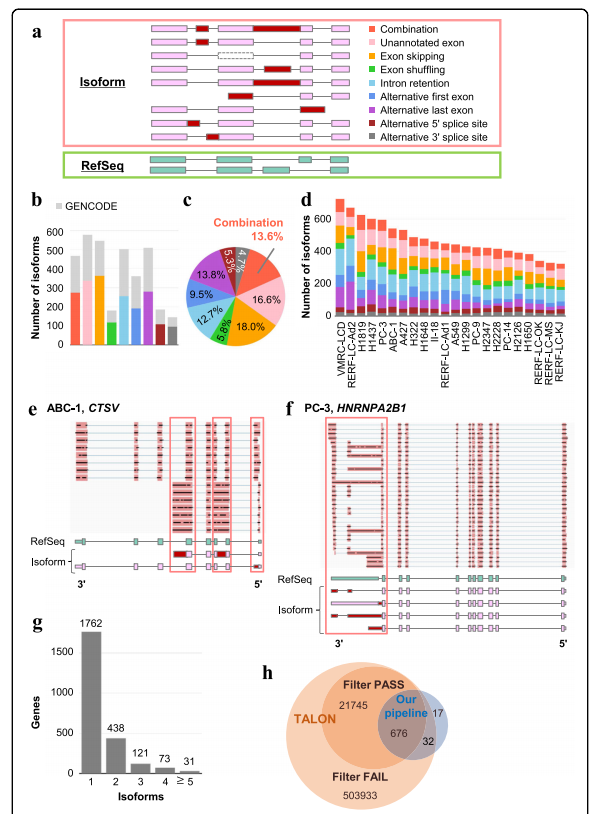 每種非小細胞肺癌細胞系的模式和數(shù)量代表特征性異常剪接事件(圖一d)。轉(zhuǎn)錄本的數(shù)量從323到725不等。不同細胞系的轉(zhuǎn)錄本組成不同。例如,內(nèi)含子保留和替代的最后一個外顯子構成了RERF-LC-Ad2中大比例的同種類型,而未標記的外顯子和外顯子跳躍是H1819的特征。這些結果表明,即使在細胞系中,異常剪接轉(zhuǎn)錄本的模式也是多樣的。剪接事件的一個新的復雜組合轉(zhuǎn)錄本的例子如圖1e所示。CTSV在ABC-1細胞中表達了兩種亞型,其中一種包括發(fā)生在外顯子2和3之間的替代性最后一個外顯子和內(nèi)含子保留的組合。