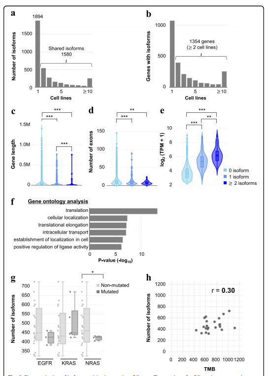 為了表明富含同種亞型的基因,作者比較了有或無的同種亞型基因長度、外顯子數(shù)量和表達水平。與不含同種亞型的基因相比,含有至少一種同亞型的基因顯示出更短的序列長度,并且由較少數(shù)量的外顯子組成;然而,發(fā)現(xiàn)含有同種亞型的基因的表達水平明顯升高。作者還發(fā)現(xiàn),同種亞型的多樣性與基因長度和表達水平有關。具有一種同種亞型的細胞系的基因顯示了具有兩種或多種同種亞型在基因長度和表達水平上的顯著差異。例如,在VMRC-LCD中,富含同種亞型的基因往往比只有一種同亞型的基因長度更短,表達量更高(圖2c–e)。