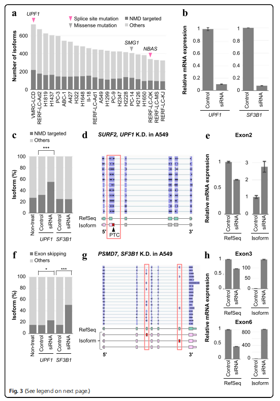 SF3B1是一種眾所周知的剪接因子,在多種疾病中發(fā)生突變,并導致異常剪接亞型的增加。作者通過SF3B1敲除評估剪接損傷的影響以及研究剪接因子的畸變是否影響轉(zhuǎn)錄本的產(chǎn)生。作者發(fā)現(xiàn)外顯子跳躍的比例顯著增加(圖3f),例如,PSMD7的外顯子3和6 在敲除后被改變(圖3g)。SF3B1-depleted的A549細胞中,外顯子跳躍亞型的表達PSMD7在中顯著增加,相反,RefSeq類型減少。為了確認剪接位點近端區(qū)域的共有序列,作者收集了僅在SF3B1在A549細胞中敲除檢測到的外顯子跳躍異構體。在這項分析中,作者用新的剪接連接的10 bp的區(qū)域,并跳過了外顯子。具有外顯子跳躍亞型的基因在翻譯和泛素-蛋白酶體途徑中顯示出顯著的富集,因此,這些因素的中斷可能會改變至少一些異常剪接亞型,并可能導致它們在肺癌細胞中的積累。