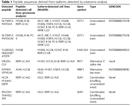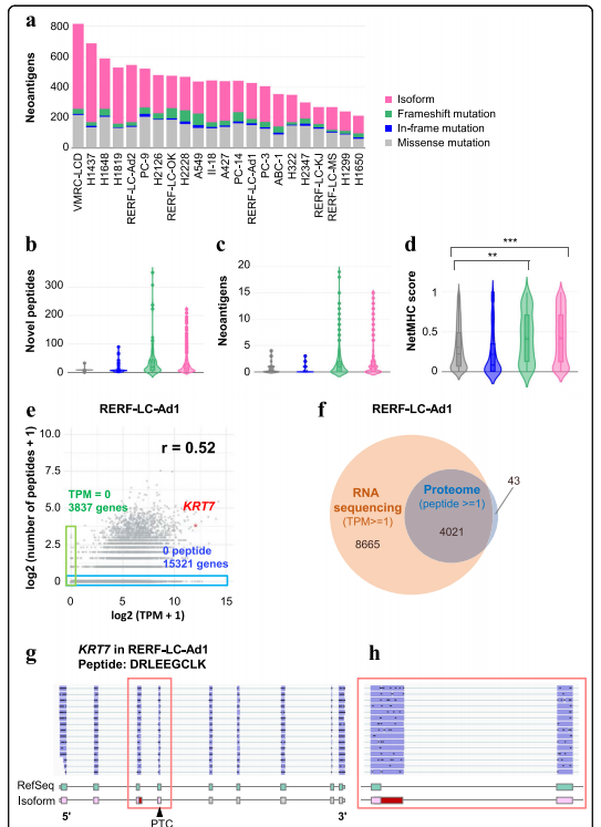為了從實驗上驗證異常的轉(zhuǎn)錄本是否被翻譯成蛋白質(zhì),對11種細胞系(A427、A549、H1650、H2228、II-18、PC-9、RERF-LC-Ad1、RERF-LC-Ad2、RERF-LC-KJ、RERF-LC-MS和VMRC-LCD)采用了使用液相色譜結合串聯(lián)質(zhì)譜(LC/MS/MS)對于多肽識別,作者基于每個細胞系的MinION數(shù)據(jù)定制了肽序列數(shù)據(jù)庫。如前所述,普通轉(zhuǎn)錄組測序由于其測序能力,顯示出比LC/MS/MS蛋白質(zhì)組學更高的基因覆蓋率。通過液相色譜/質(zhì)譜/蛋白質(zhì)組學檢測的每個基因的肽數(shù)與通過轉(zhuǎn)錄組測序數(shù)據(jù)計算的TPM相關(r= 0.52,圖4e)而且LC/MS/MS蛋白質(zhì)組學檢測到的大部分基因也被轉(zhuǎn)錄組測序覆蓋(圖4f)。作者成功地檢測到7個翻譯自異常剪接亞型特異性區(qū)域的多肽。例如,衍生自外顯子3中具有選擇性5’剪接的轉(zhuǎn)錄本的多肽KRT7存在于RERF-LC-Ad1(圖4g)。在GENCODE數(shù)據(jù)庫中沒有發(fā)現(xiàn)這種轉(zhuǎn)錄本,但是在ENST00000547613中觀察到了這種同中型特異性連接,其被認為是處理過的轉(zhuǎn)錄本。MinION也證實了在H1437、H2126和II-18中的表達(表1).此外,這種轉(zhuǎn)錄本有可能產(chǎn)生幾個新抗原,這些新抗原是由NetMHC預測的。這些結果表明,一些異常剪接亞型被真正翻譯成肽,并可能在癌癥中產(chǎn)生新抗原中發(fā)揮作用。