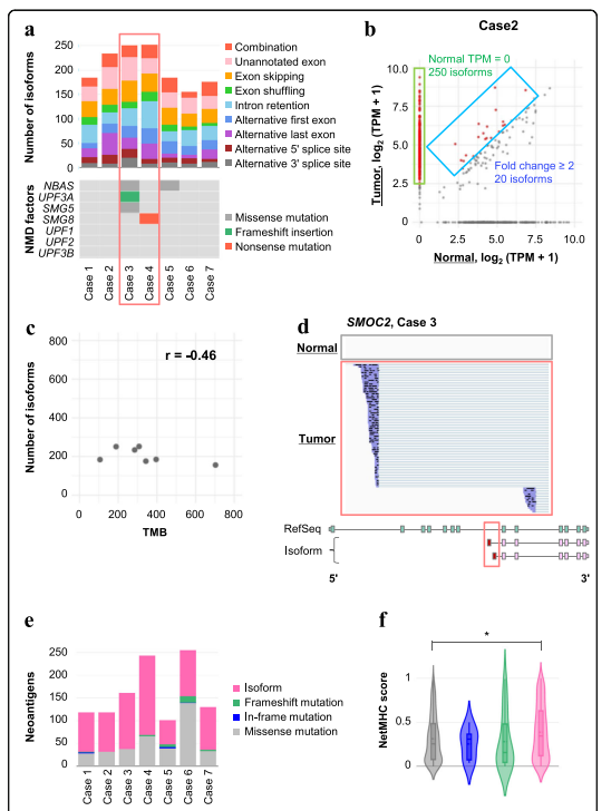 為了檢查體內(nèi)癌細胞中是否也存在異常剪接轉(zhuǎn)錄本,作者接下來分析了臨床肺癌標本。應用與臨床樣本細胞系分析相同的分析方案,能夠識別每個患者的異常剪接亞型(圖5a)。作者選擇了在腫瘤樣本中表達水平比非腫瘤樣本高至少兩倍的轉(zhuǎn)錄本(圖5b)在所有臨床樣本中鑒定出982種富含癌癥的剪接亞型。其中,448種亞型在參考序列或基因代碼。異常亞型的數(shù)量和TMB之間沒有顯著的相關性(圖5c)。作為檢測到的轉(zhuǎn)錄本的一個例子,在SMOC2如圖1所示5d和僅在病例3的腫瘤中表達。類似于細胞系分析的結果,作者可以識別獨立剪接事件的幾種獨特組合模式,這些模式占這些未標記亞型的14.5%。還確定了保留在癌細胞中的潛在的NMD靶向亞型,這表明NMD機制在相應的癌癥中被破壞。值得注意的是,在病例3和4中,發(fā)現(xiàn)*大數(shù)量的潛在NMD靶向亞型在關鍵NMD因子中存在移碼或無義突變,UPF3B和SMG8(圖5a)。