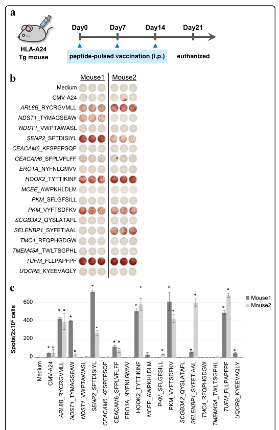 為了評估從異常剪接亞型和移碼突變中鑒定的肽的抗原性,作者根據(jù)圖6a所示的方案用候選肽免疫HLA-A24轉(zhuǎn)基因小鼠。作者根據(jù)人類白細胞抗原-α:24:02的網(wǎng)絡MHC評分選擇了17種候選肽(表2)。作者通過BLAST-P證實了該肽序列與人或小鼠蛋白質(zhì)數(shù)據(jù)庫中的序列沒有相似性,最后一次接種疫苗一周后,作者從小鼠中分離出脾細胞,并對分離物進行酶聯(lián)免疫吸附斑點(ELISpot)分析。通過這樣做,作者試圖檢測新抗原特異性脾淋巴細胞反應。酶聯(lián)免疫吸附試驗結果顯示,17個多肽中有8個誘導顯著高的干擾素-γ產(chǎn)生(n= 2)與PBS組和單獨佐劑組相比(圖6b,c)。這些結果表明,來自剪接亞型和移碼突變的多肽可以通過與人類白細胞抗原的相互作用激活T細胞反應。