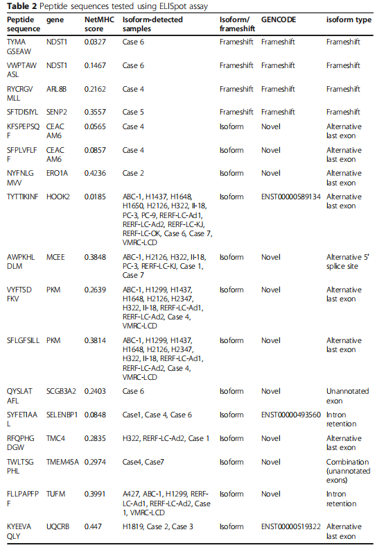 結果:對22組細胞系進行全長轉(zhuǎn)錄組測序,共鑒定出2021種新的剪接異構體。其中一些異構體的蛋白質(zhì)表達通過蛋白質(zhì)組分析進行驗證。無義介導的mRNA衰減因子(NMD)UPF1的降低和剪接因子SF3B1的減少增加了異常轉(zhuǎn)錄本的比例。NetMHC對每種HLA分子結合的親和力的評估顯示,一些亞型可能產(chǎn)生新抗原候選體,還在7個非小細胞肺癌標本中發(fā)現(xiàn)了剪接亞型。酶聯(lián)免疫吸附斑點試驗表明,大約一半的候選肽有可能通過與人類白細胞抗原分子的相互作用激活T細胞反應。大約一半的多肽通過與HLA分子的相互作用具有激活T細胞反應的潛力。最后,作者通過參考構建的目錄來估計癌癥基因組圖譜(TCGA)數(shù)據(jù)庫中的亞型數(shù)量,發(fā)現(xiàn)NMD因子的破壞與TCGA-Lung Adenocarcinoma數(shù)據(jù)集中發(fā)現(xiàn)的剪接亞型數(shù)量顯著相關。