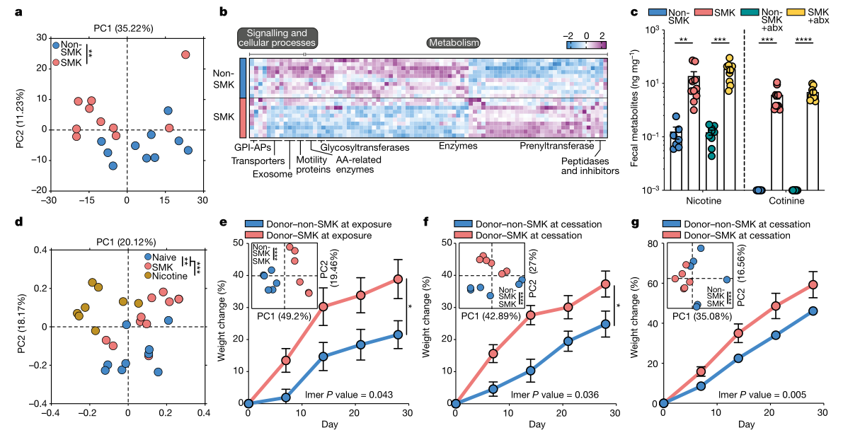 吸煙是全球發病率和可預防死亡的主要原因。戒煙導致的體重增加(SCWG)是戒煙的主要障礙。研究者使用小鼠模型來證明吸煙和戒煙會導致一種由香煙相關代謝物在腸道內涌入的不良生物狀態。抗生素治療可預防SCWG,相反,將之前暴露在香煙煙霧中的小鼠的糞菌移植到的吸煙暴露的無菌小鼠上,會導致不同飲食和小鼠品系的體重過度增加。在代謝方面,微生物組誘導的SCWG涉及協同宿主和微生物組將飲食中的膽堿分流到二甲基甘氨酸,推動腸道能量收集的增加,再加上交叉調節的減肥代謝物N-乙酰甘氨酸的耗盡,可能還受到其他與香煙煙霧相關的不同含量代謝物的影響。在不吸煙的情況下,二甲基甘氨酸和N-乙酰甘氨酸也可能調節體重和相關的脂肪組織免疫。該研究發現了一種依賴微生物組的SCWG協調機制,它可能被用來提高戒煙成功率,甚至在非吸煙環境中糾正代謝紊亂。