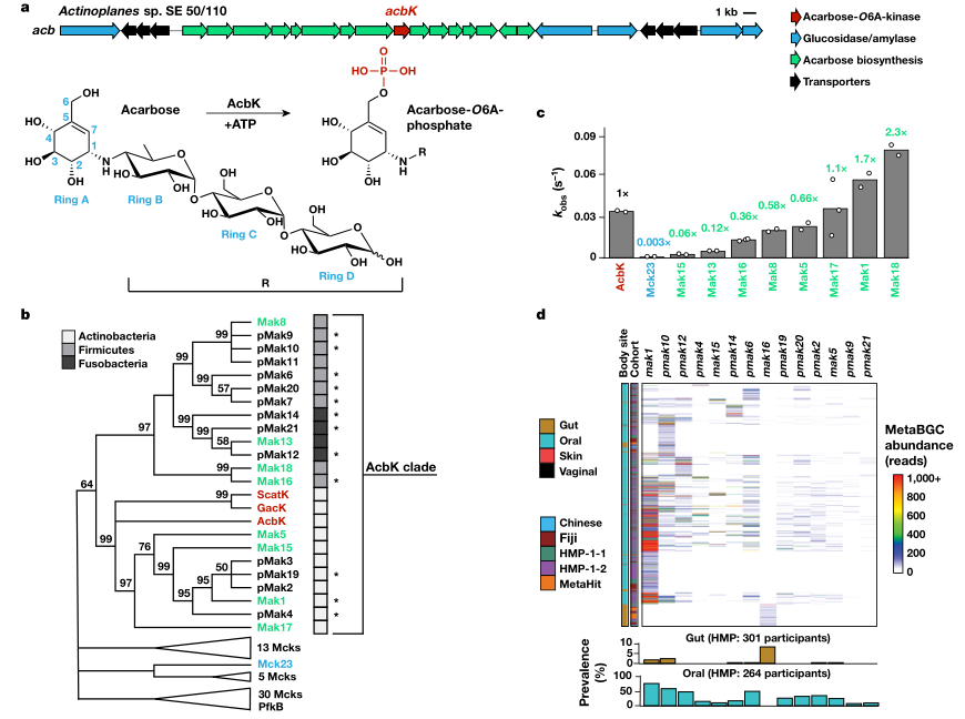 口服非抗生素藥物會無意中影響人體微生物組的組成。例如,阿卡波糖(一種用于治療2型糖尿病的天然衍生的α-葡萄糖苷酶抑制劑)對小鼠模型和人類的腸道微生物群具有深遠的副作用。阿卡波糖是從土壤細菌放線菌中發現的,并由其工業化生產。人類微生物組編碼了大量的生化酶和生化途徑,其中大部分仍未確定。研究者使用基于宏基因組學的搜索策略,發現人類腸道和口腔微生物組的細菌成員編碼的酶選擇性地磷酸化臨床上使用的抗糖尿病藥物阿卡波糖,導致其失活。阿卡波糖是人類和細菌α-葡萄糖苷酶的抑制劑,限制了目標生物代謝復雜碳水化合物的能力。利用生化分析、X射線結晶學和宏基因組學分析發現,微生物來源的阿卡波糖激酶為其所在的生物體提供了對抗阿卡波糖活性的保護優勢,并且廣泛存在于西方和非西方人群的微生物群中。這些結果提供了微生物群對非抗生素藥物的廣泛耐藥性的例子,并表明阿卡波糖耐藥性已經在人類微生物群中傳播,作為一種防御策略對抗潛在的內源性密切相關分子的產生。
