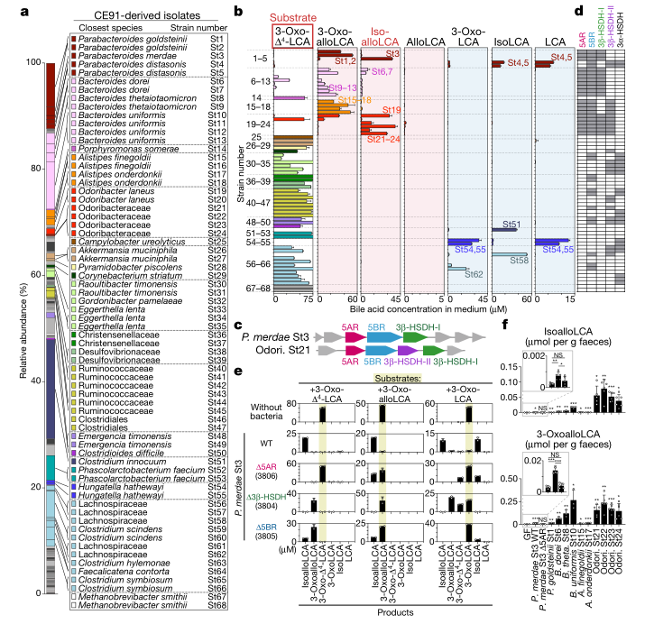 長期以來,微生物組一直被認為是決定老年人健康狀況的關鍵因素,因為它在控制消化功能、骨密度、神經活動、免疫力和對病原體感染的抵抗力方面發揮著作用。百歲老人對衰老相關疾病、慢性炎癥和傳染病的易感性降低。在該研究中,發現百歲老人有一個獨特的腸道微生物組,其中富含能夠產生獨特的次級膽汁酸的微生物,包括各種異構體的石膽酸(LCA):3-oxo-,allo-,3-oxoallo-和isoallolithocholic acid。在這些膽汁酸中,isoalloLCA的生物合成途徑從未被報導過。從一名百歲老人糞便微生物群中篩選出了68株細菌,在體外和體內都鑒定了Odoribacteraceae菌株是產生同種isoalloLCA的有效菌株。此外,還發現5-羥基類固醇脫氫酶(3-α-β-HSDH)和5-羥基類固醇脫氫酶(5-β-reductase,5AR)負責isoalloLCA的產生。IsoalloLCA對革蘭氏陽性多重耐藥病原菌,包括艱難梭狀芽胞桿菌和屎腸球菌有很強的抗菌活性。這些發現表明,特定膽汁酸的代謝可能與降低感染病原體的風險有關,從而可能有助于維持腸道內環境的穩定。