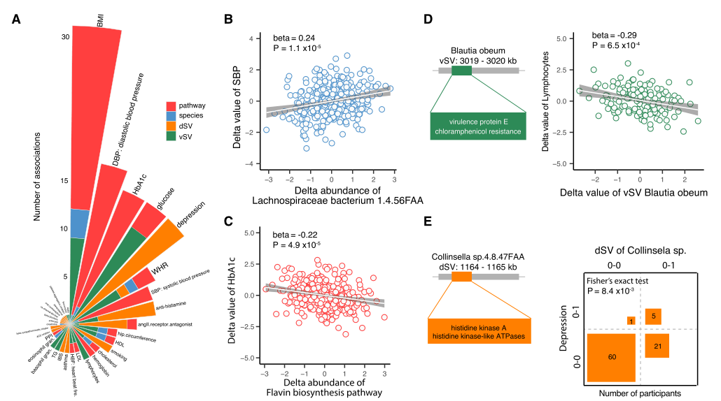 人的腸道中有各種各樣的微生物群落,這些微生物在個體間表現出很大的變異。該研究通過對腸道微生物群、51個人類表型和338個個體的1183個代謝物的血漿水平進行4年的跟蹤調查,描述了微生物的穩定性和變異與宿主生理的關系。利用這些個體特異性和時間穩定的微生物圖譜,包括細菌SNPs和結構變異,開發了一種微生物指紋圖譜方法,在對相隔4年的宏基因組樣本進行分類時,準確率高達85%。將該指紋方法應用到獨立的HMP隊列中,對于相隔1年的樣本,準確率為95%。進一步觀察了多種細菌種類的豐度、代謝途徑、結構變異以及菌株替換的時間變化。報告了190個縱向微生物與宿主表型相關,519個與血漿代謝物相關。這些關聯包含心臟代謝特征、維生素B和尿毒癥毒素。最后,中介效應分析表明腸道微生物群可能通過其代謝產物影響心臟代謝健康。