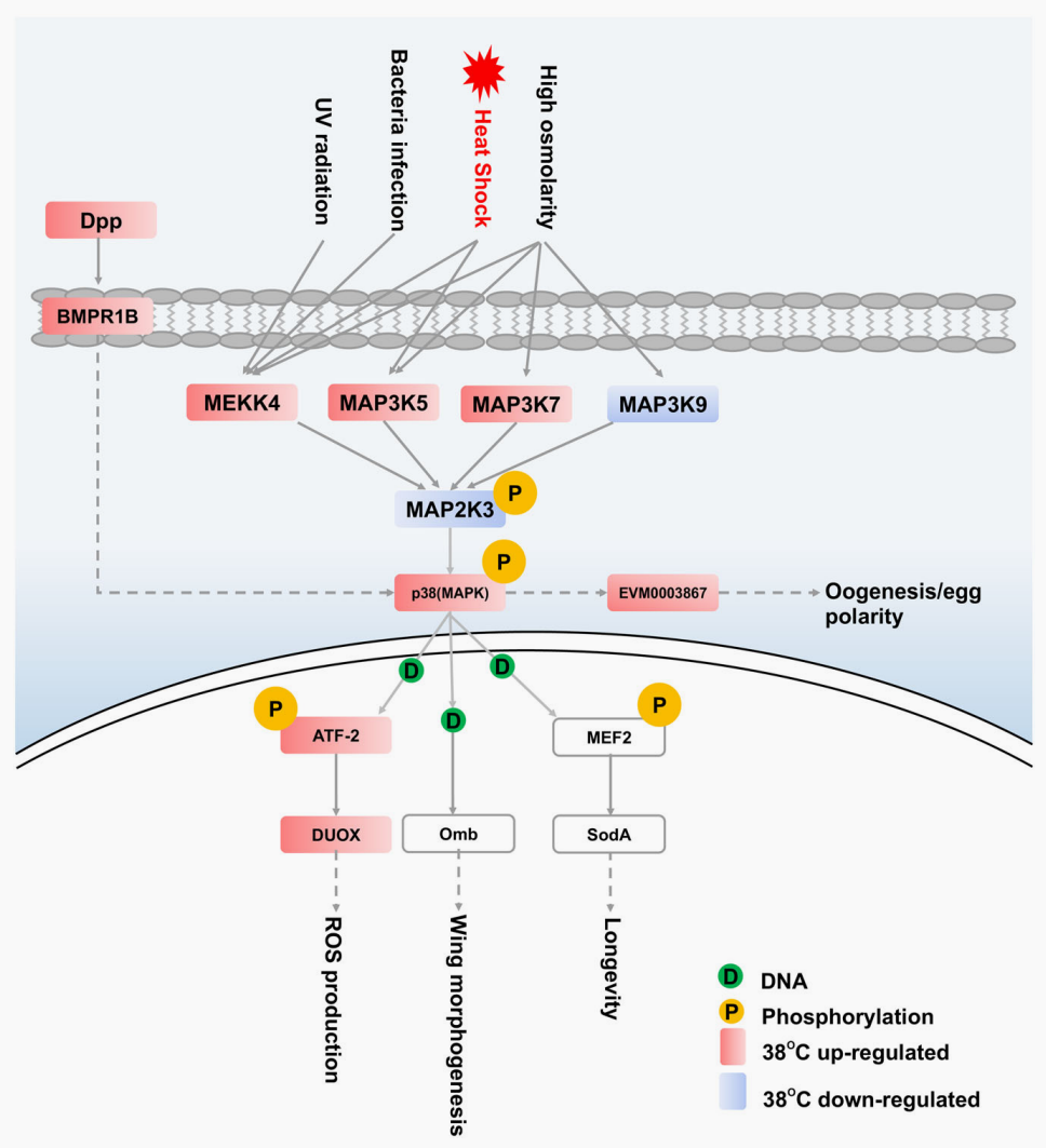 作者進一步結合不同逆境條件處理下的轉錄組數據,分析推測出橘小實蠅中熱休克蛋白的相對穩定高表達是其快速適應逆境的內在機制。并發現在高溫條件下,p38 MAPK通路關鍵基因表現為應激性高表達,表明p38MAPK信號通路在橘小實蠅快速適應新環境的過程中發揮重要作用,并且可能是橘小實蠅在非生物脅迫下維持穩態機制的核心。