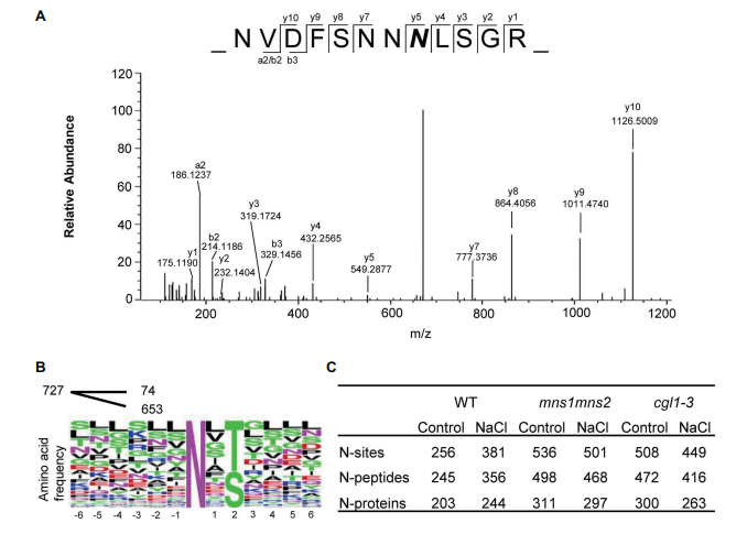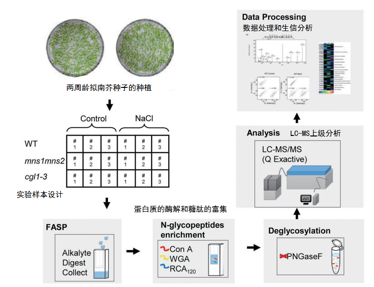 在植物中,N-糖基化參與許多生物過程,包括類固醇激素受體的?ER?質量控制、配子體識別,?亞細胞轉運,?植物先天免疫?和氣孔發育等,主要是通過調節底物蛋白的穩定性、功能或亞定位實現調控過程。此外研究發現復雜的N-聚糖生物合成失敗會導致擬南芥幼苗對鹽敏感,但對其潛在的分子機制仍知之甚少。本文利用納升流液相色譜串聯質譜?(nanoLC-MS/MS)?技術進行了無標記蛋白質組學分析,比較分析了野生型?(WT)?和兩個抗鹽脅迫的突變體的蛋白質組差異。
